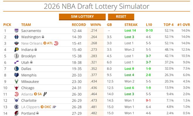 國王本賽季的目標早就是擺爛,目前國王12勝44負聯盟倒數第一,他的狀元簽概率14%,前四簽概率52.1%。