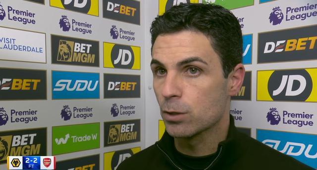 英超聯賽第31輪,阿森納在客場2-2戰平狼隊。賽后,阿森納主教練阿爾特塔接受了《當日比賽》節目的采訪。