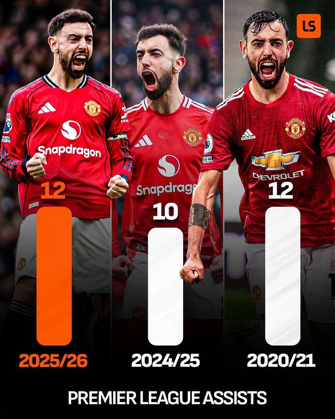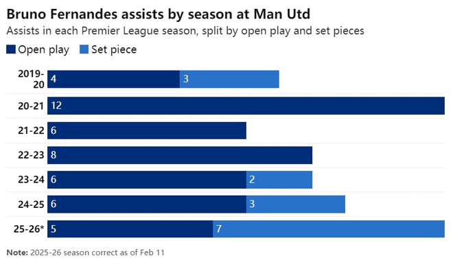 與個(gè)人巔峰時(shí)期相比,現(xiàn)在B費(fèi)的直塞少了,但定位球助攻增加。2024年8月至今,他通過角球和任意球助攻10次,在聯(lián)盟中名列前茅。同期,他的運(yùn)動(dòng)戰(zhàn)助攻11次,二者幾乎平分秋色。