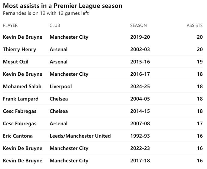 數(shù)據(jù)顯示,目前B費(fèi)27輪英超12次助攻,還需要8次助攻,才能追平2002/03賽季阿森納的亨利,以及2019/20賽季的德布勞內(nèi)共同保持的英超單賽季20次助攻最高紀(jì)錄。