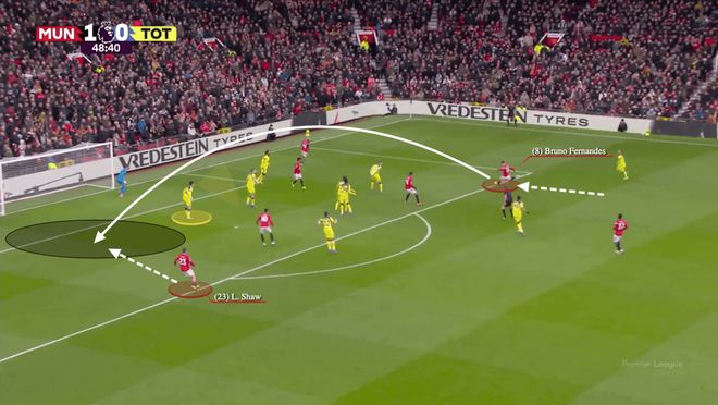 在2-0擊敗熱刺的比賽里,B費(fèi)的跑位迷惑了熱刺左后衛(wèi)德斯蒂尼·烏多吉,隨后傳給卡塞米羅,「胖虎」與姆貝莫配合未果,B費(fèi)又率先做出反應(yīng),第一時(shí)間傳中給左側(cè)的盧克·肖,后者助攻阿馬德·迪亞洛得分,可惜因?yàn)樵轿槐慌袩o效。